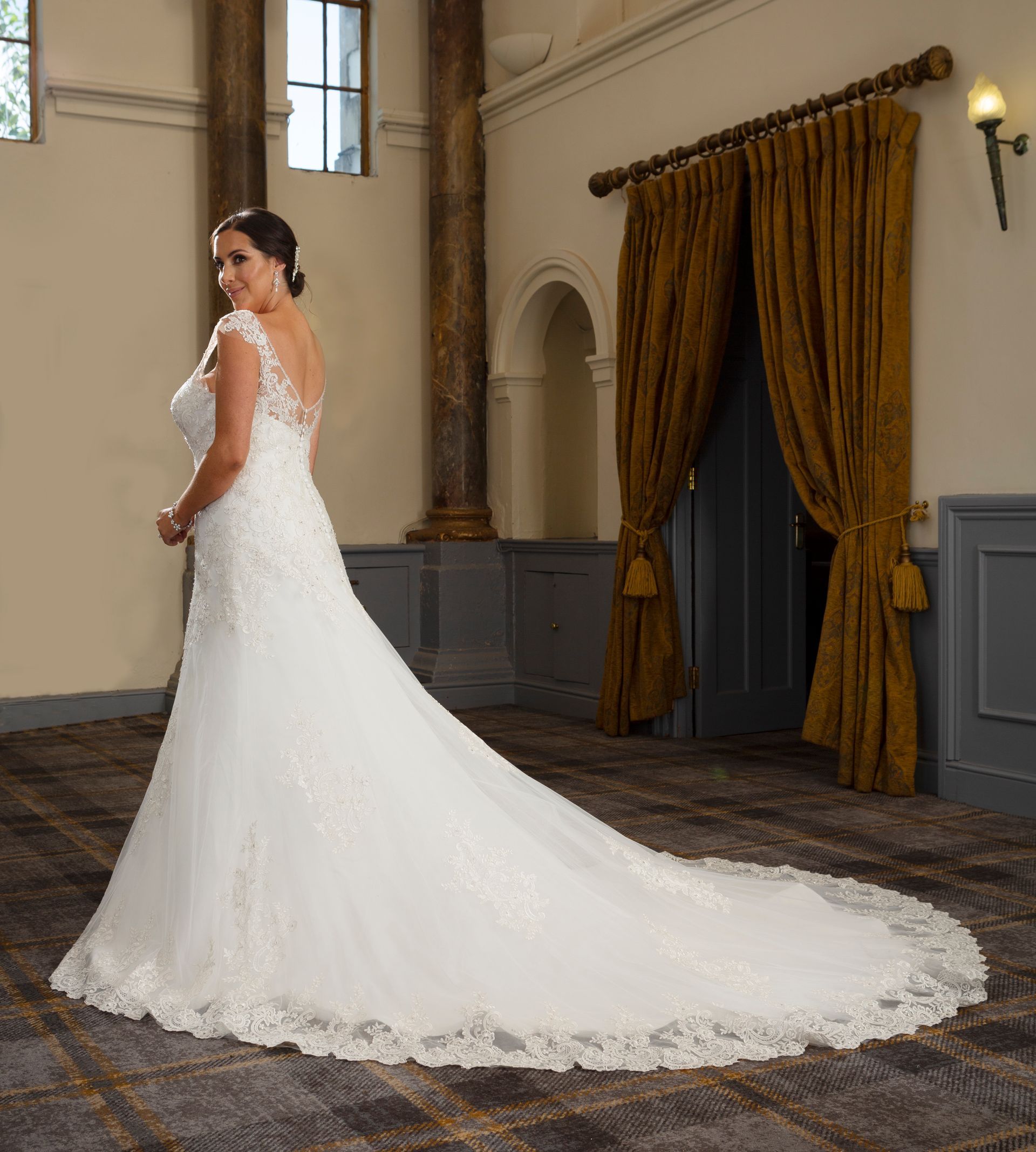 It has a lovely long train with lace edging all around the front and back, is well structured and finished to the highest quality.