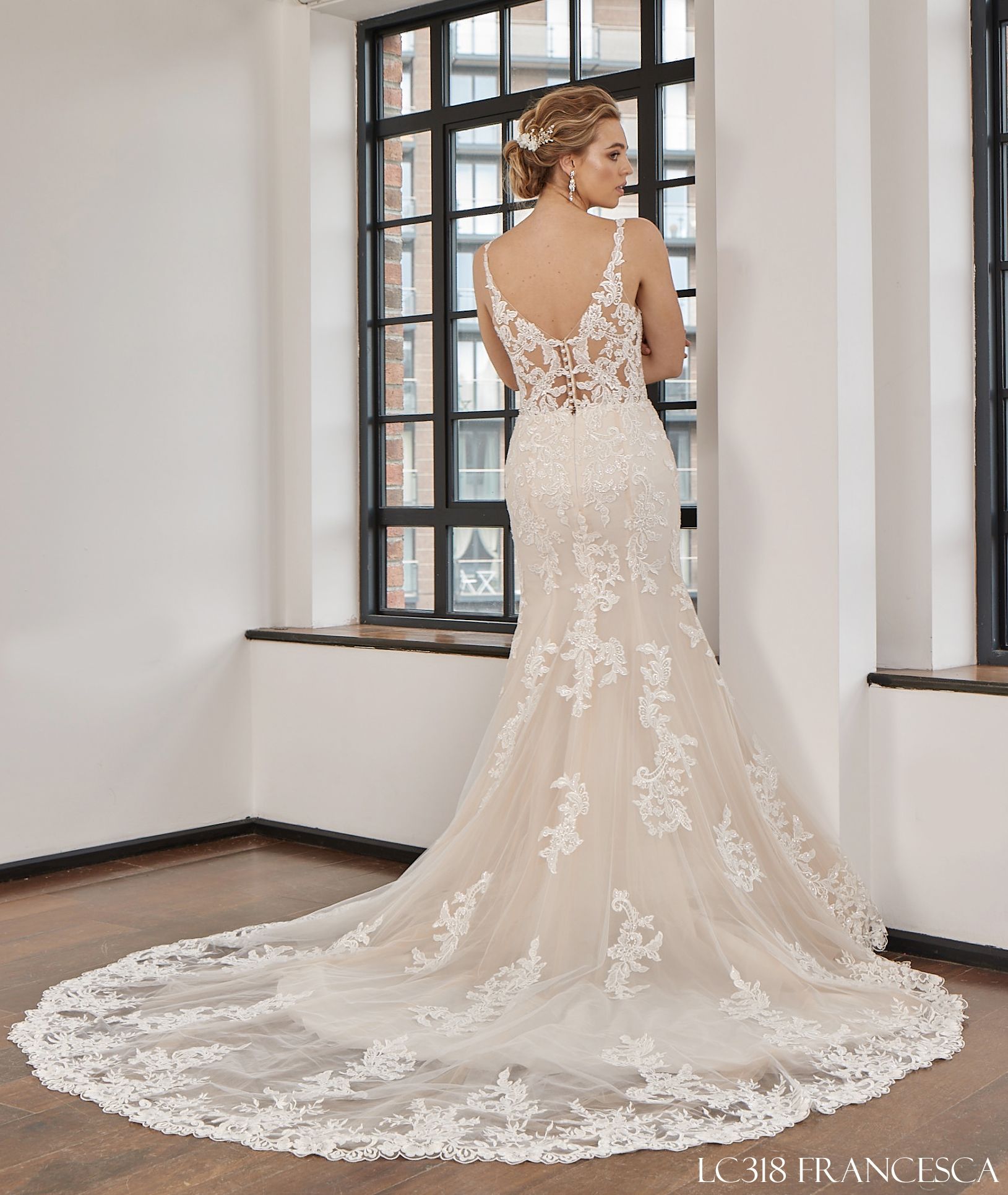 Francesca dress is a fit to flare style, sexy and elegant. She will look stunning on any bride who wants to create that modern look on her wedding day. She will be a perfect fit for a smaller and medium size bride who believes in herself and knows the kind of look she wants to achieve on her wedding day.