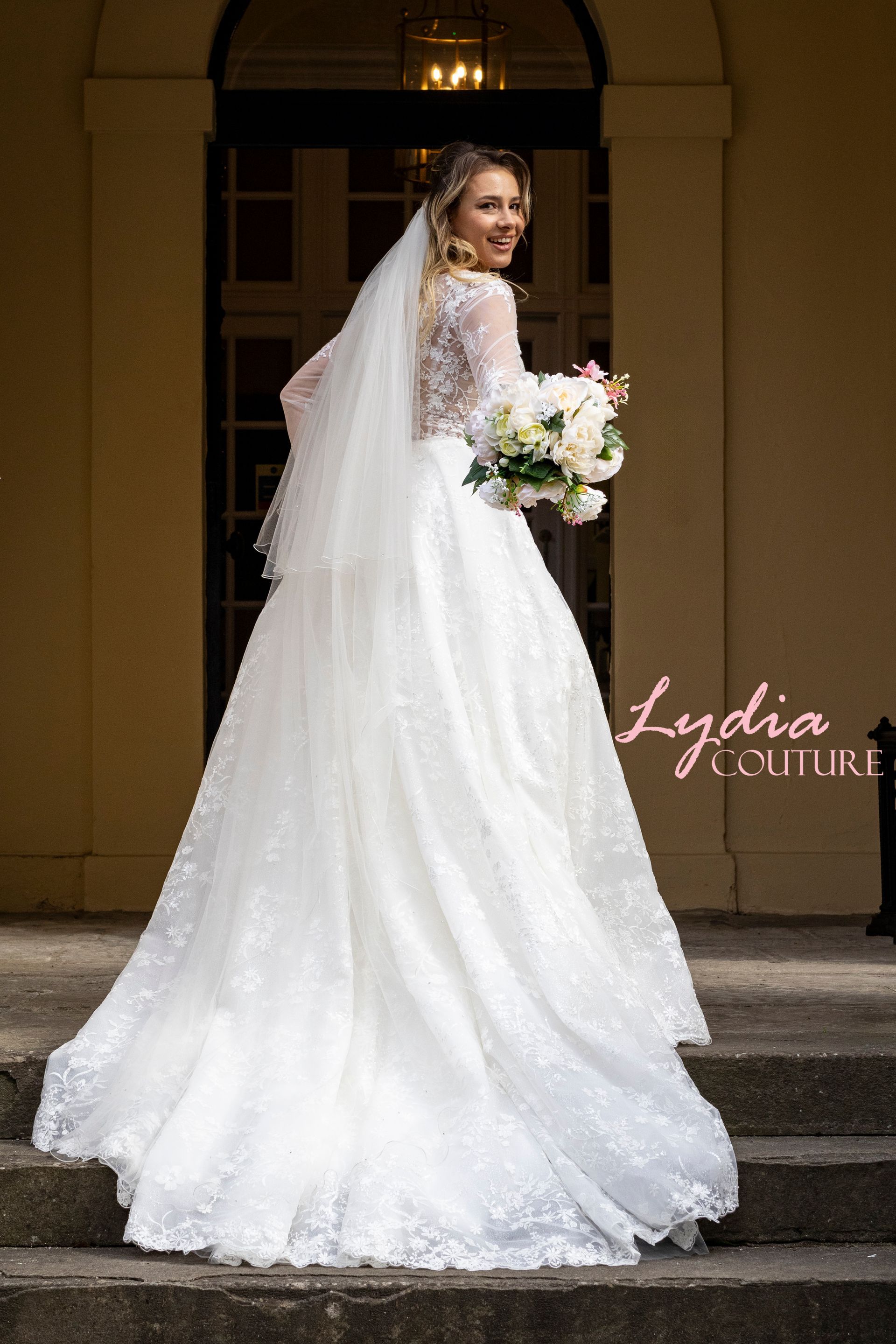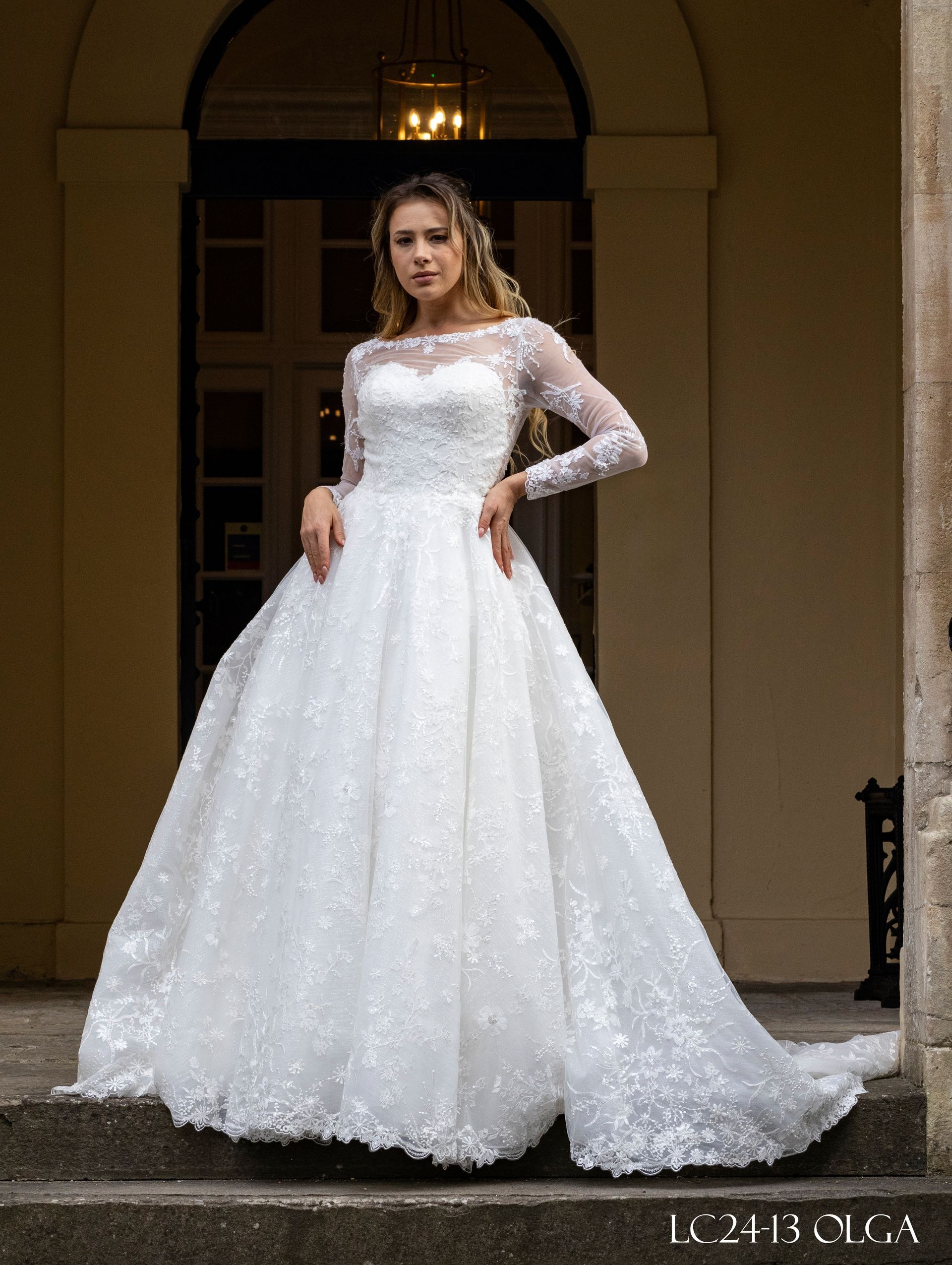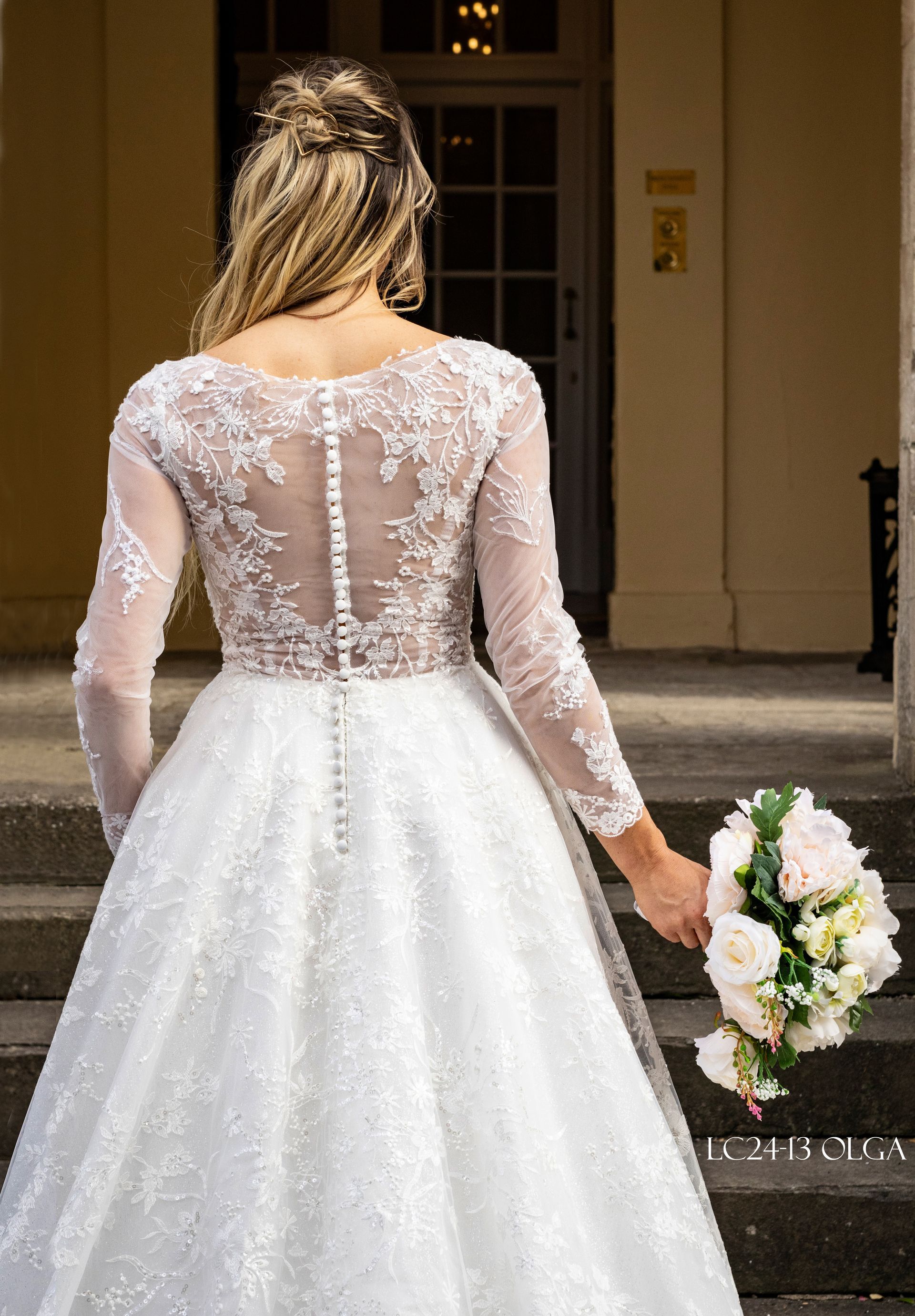 A-line ballgown style, the top part of the dress front and back is see through with long sleeves. Fabric is lace and tulle with bead and sequin decoration as well as under the skirt. The upper part of the back has button and loop and zipper on the skirt with train. Colour Ivory with option Ivory & Skin