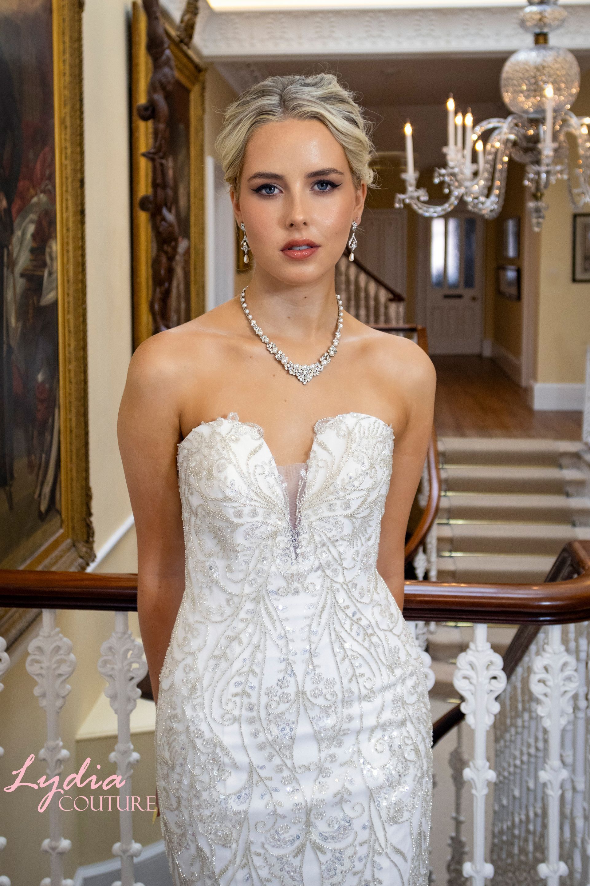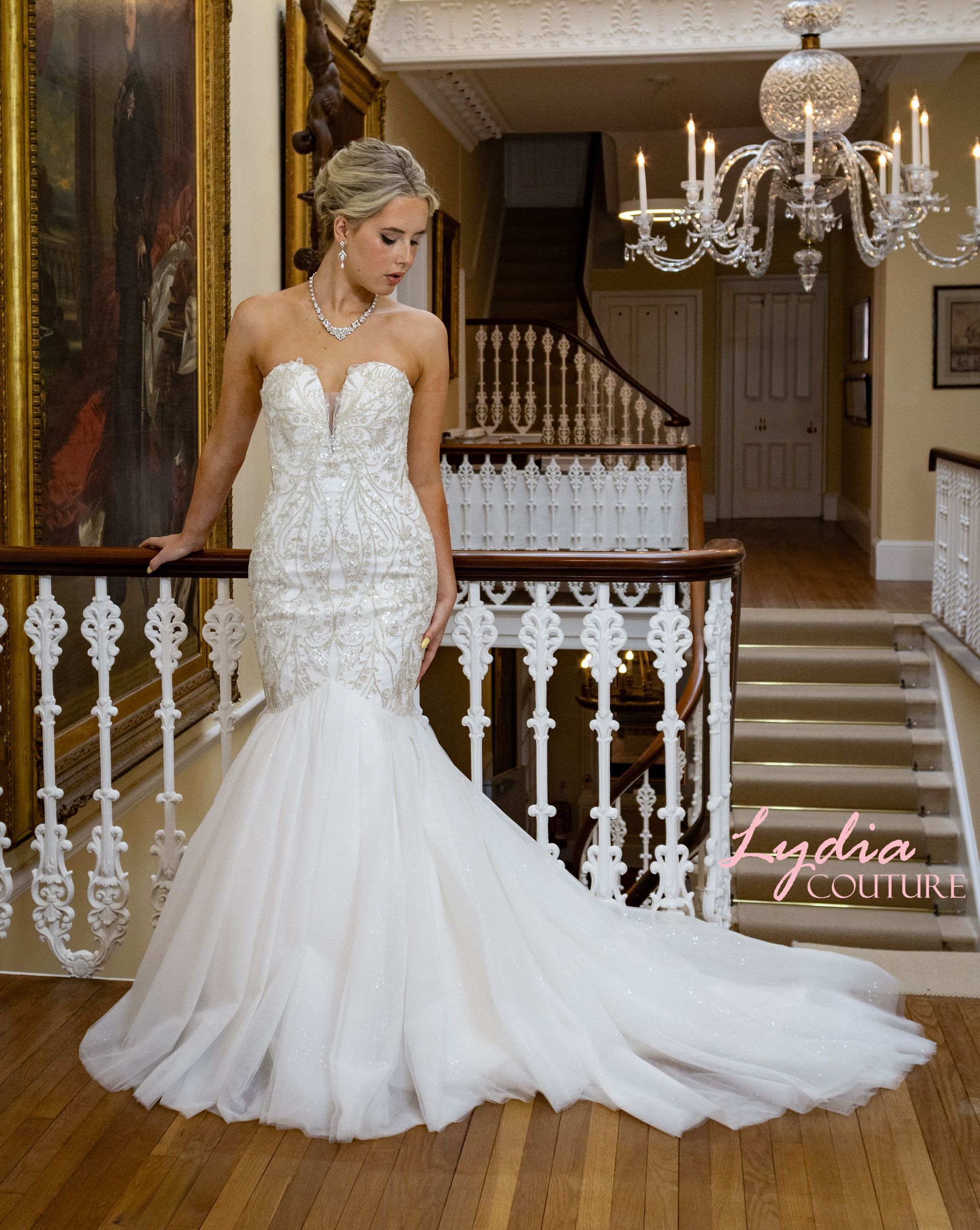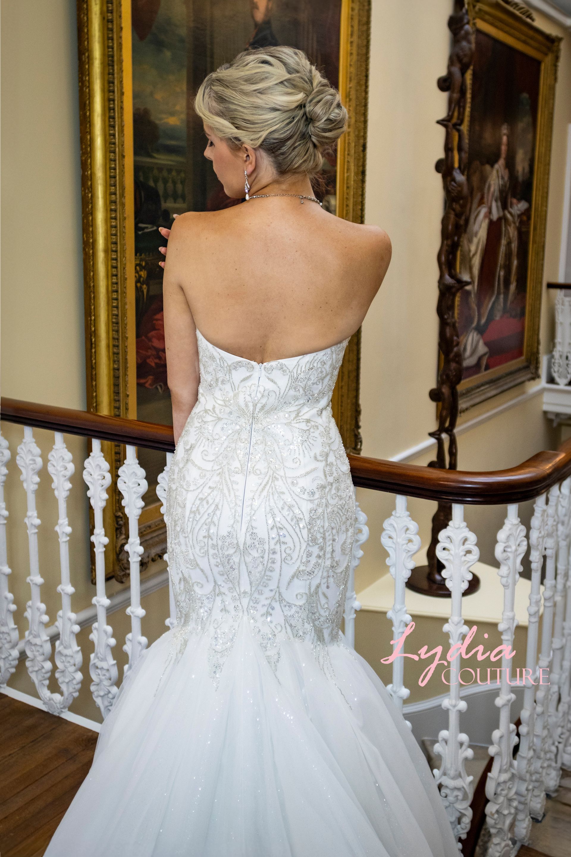 Sweetheart strapless neckline mermaid/fit to flair style, heavy crystal, pearl beads hand stitched embroidery all-over the bodice from top to the skirt joint above the knee. The rest of the skirt has shimmer tulle with train The back closure is invisible zipper. Colour Ivory