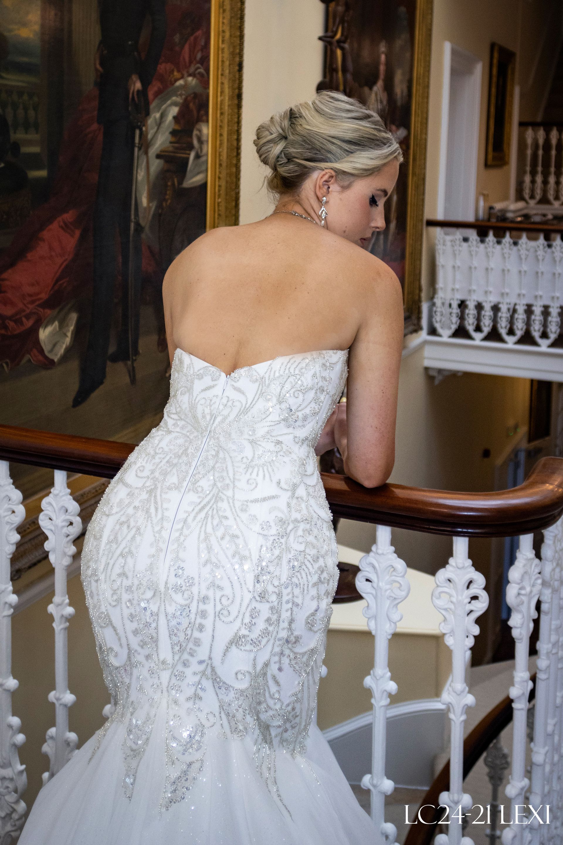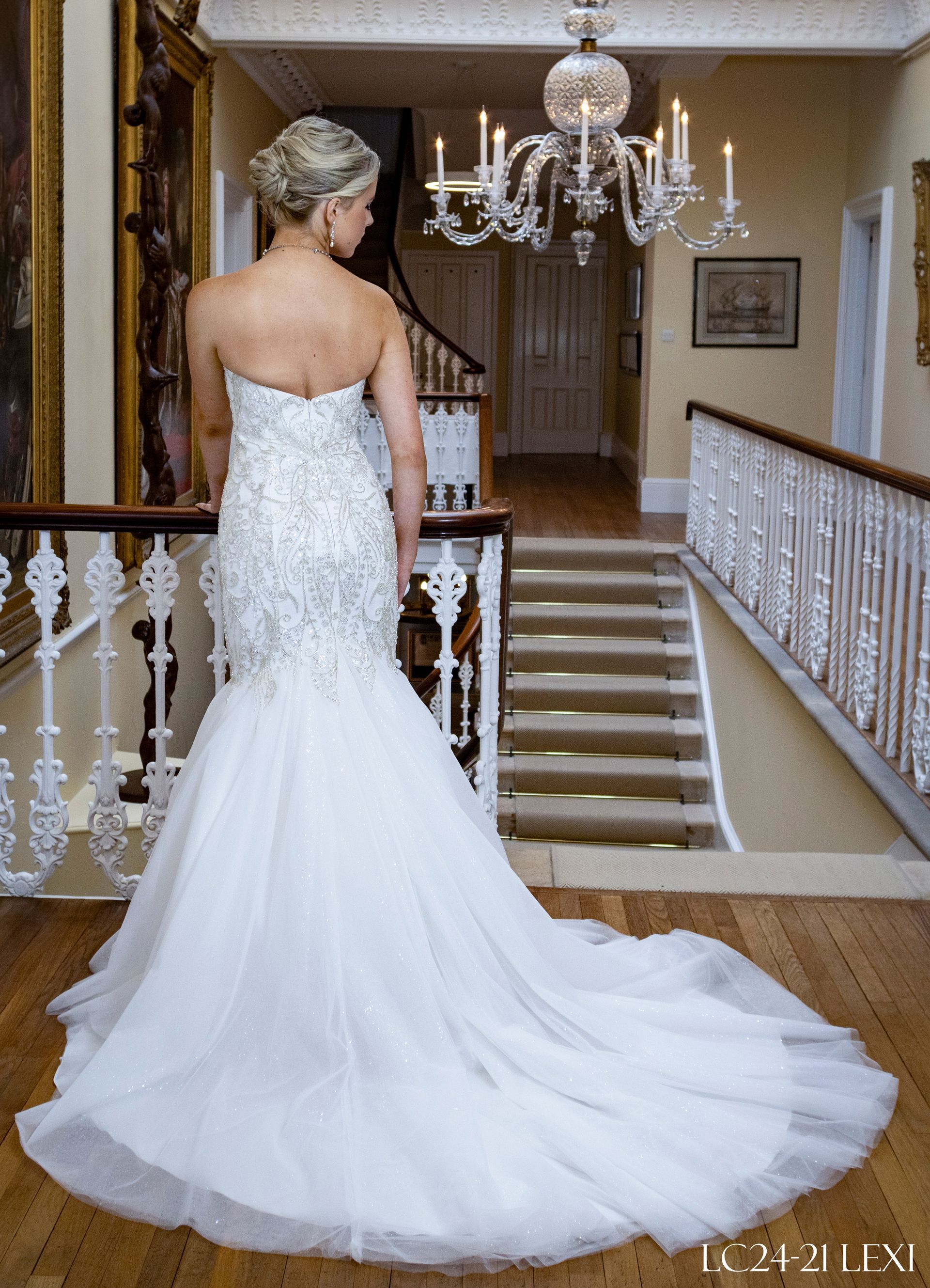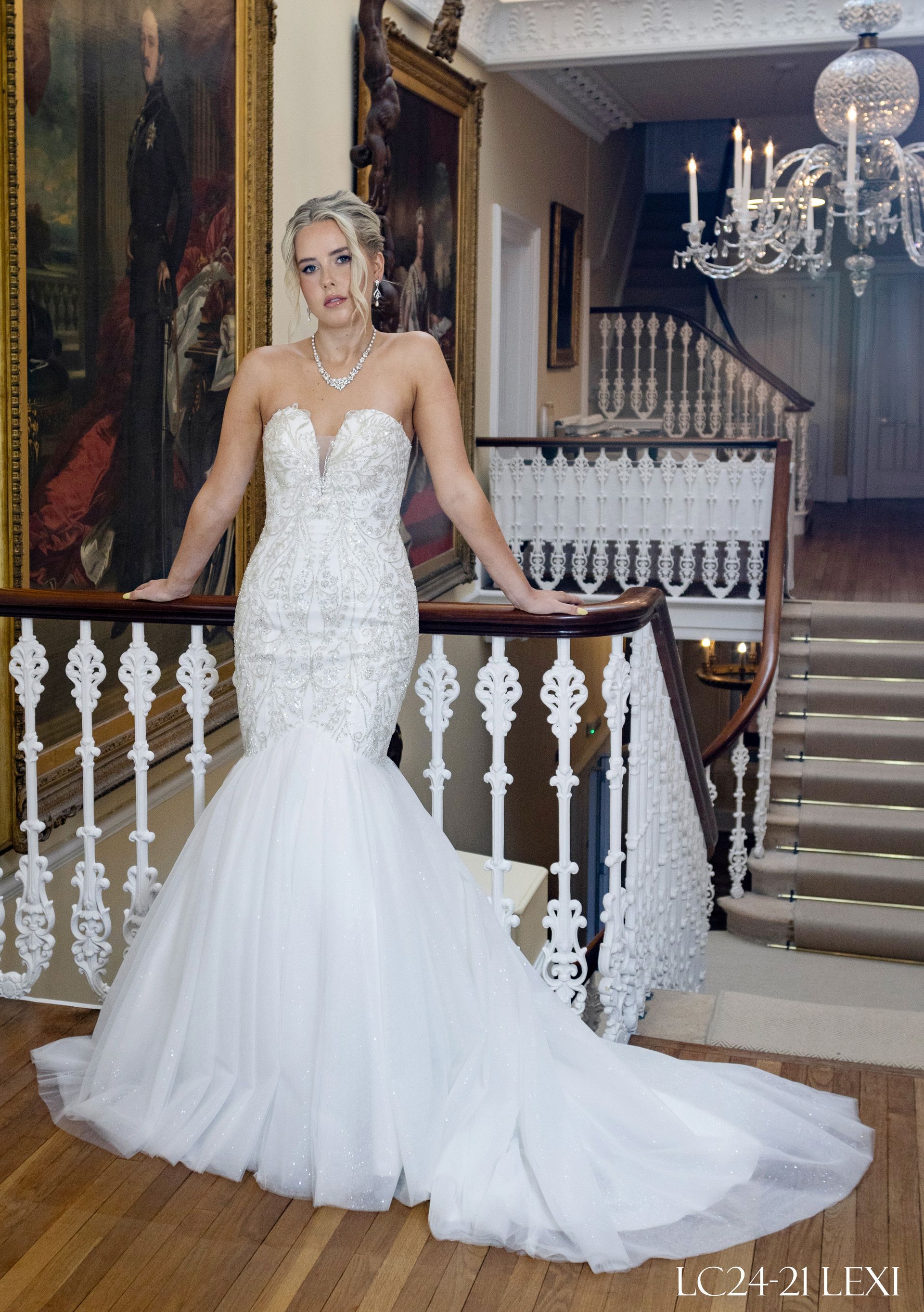 Sweetheart strapless neckline mermaid/fit to flair style, heavy crystal, pearl beads hand stitched embroidery all-over the bodice from top to the skirt joint above the knee. The rest of the skirt has shimmer tulle with train The back closure is invisible zipper. Colour Ivory