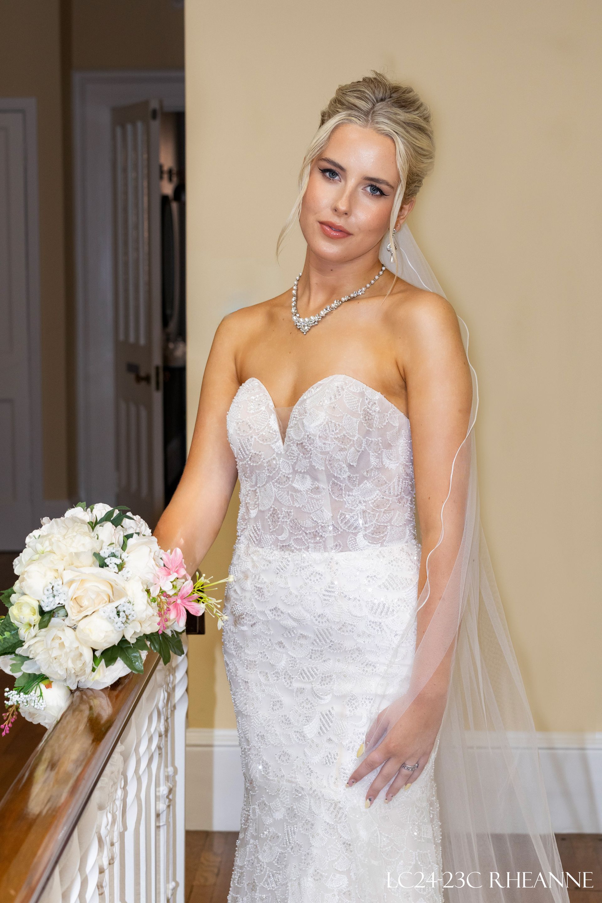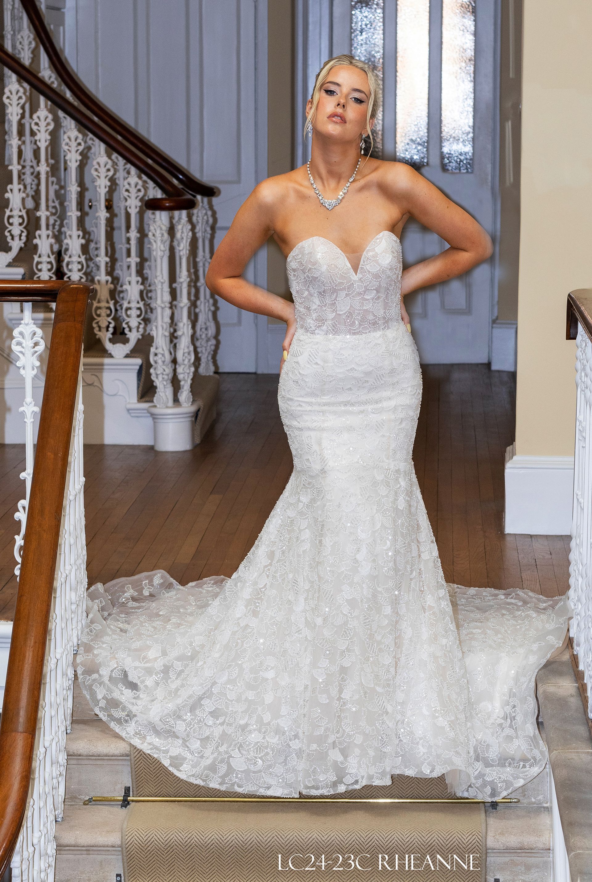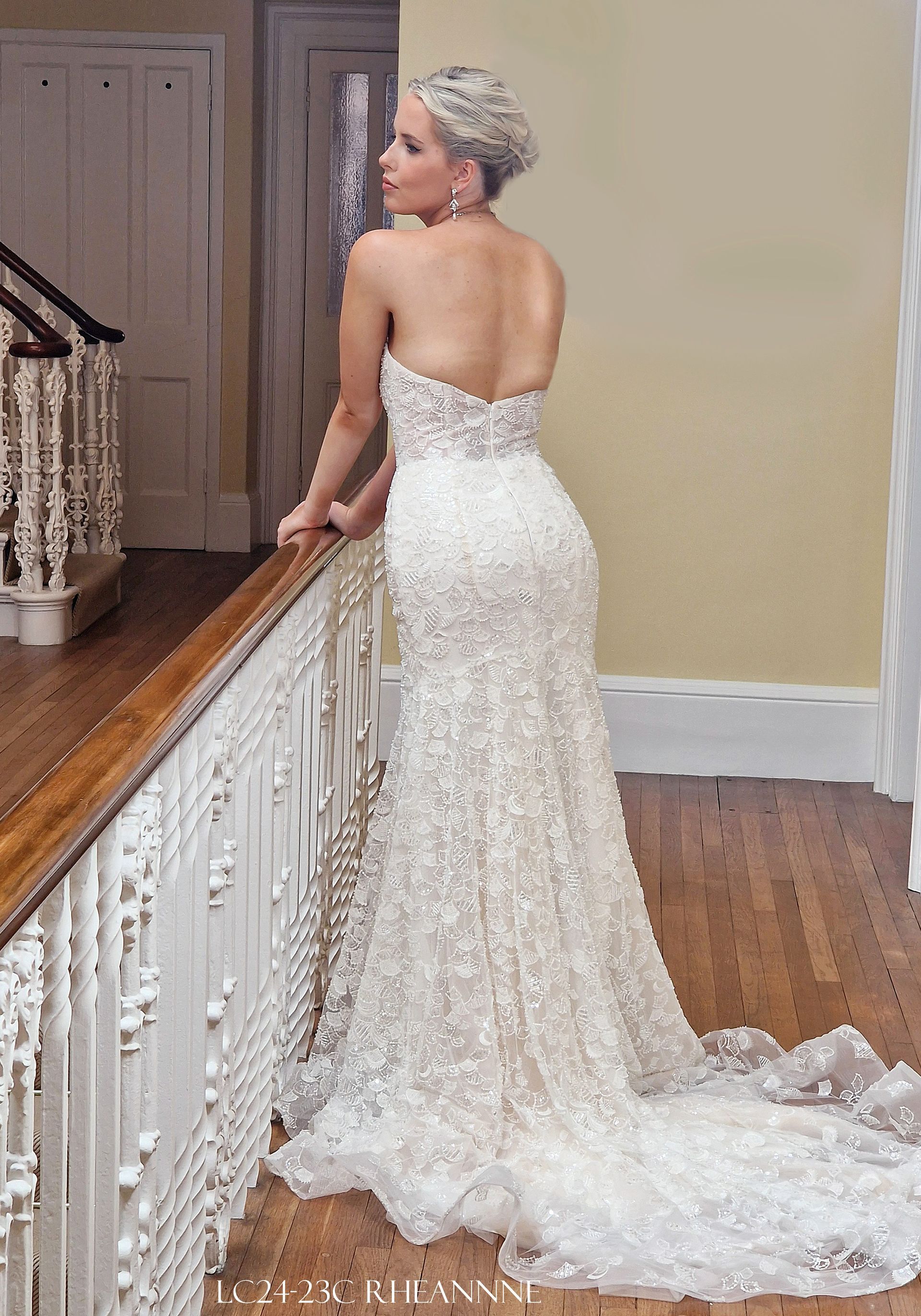 Strapless sweetheart neckline Fit to flair style transparent bodice front and back. Fabric is heavy pearl beads on the entire dress with invisible zipper closure. Colour Ivory & skin with option Ivory only