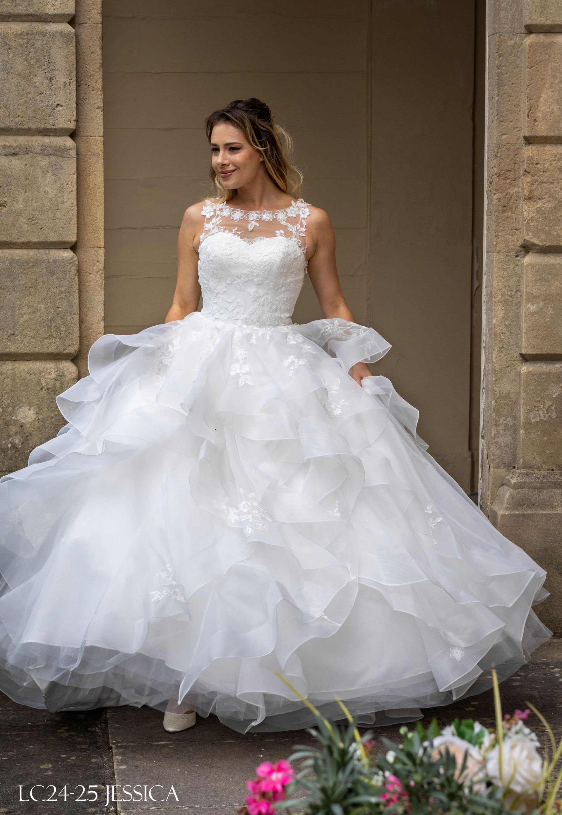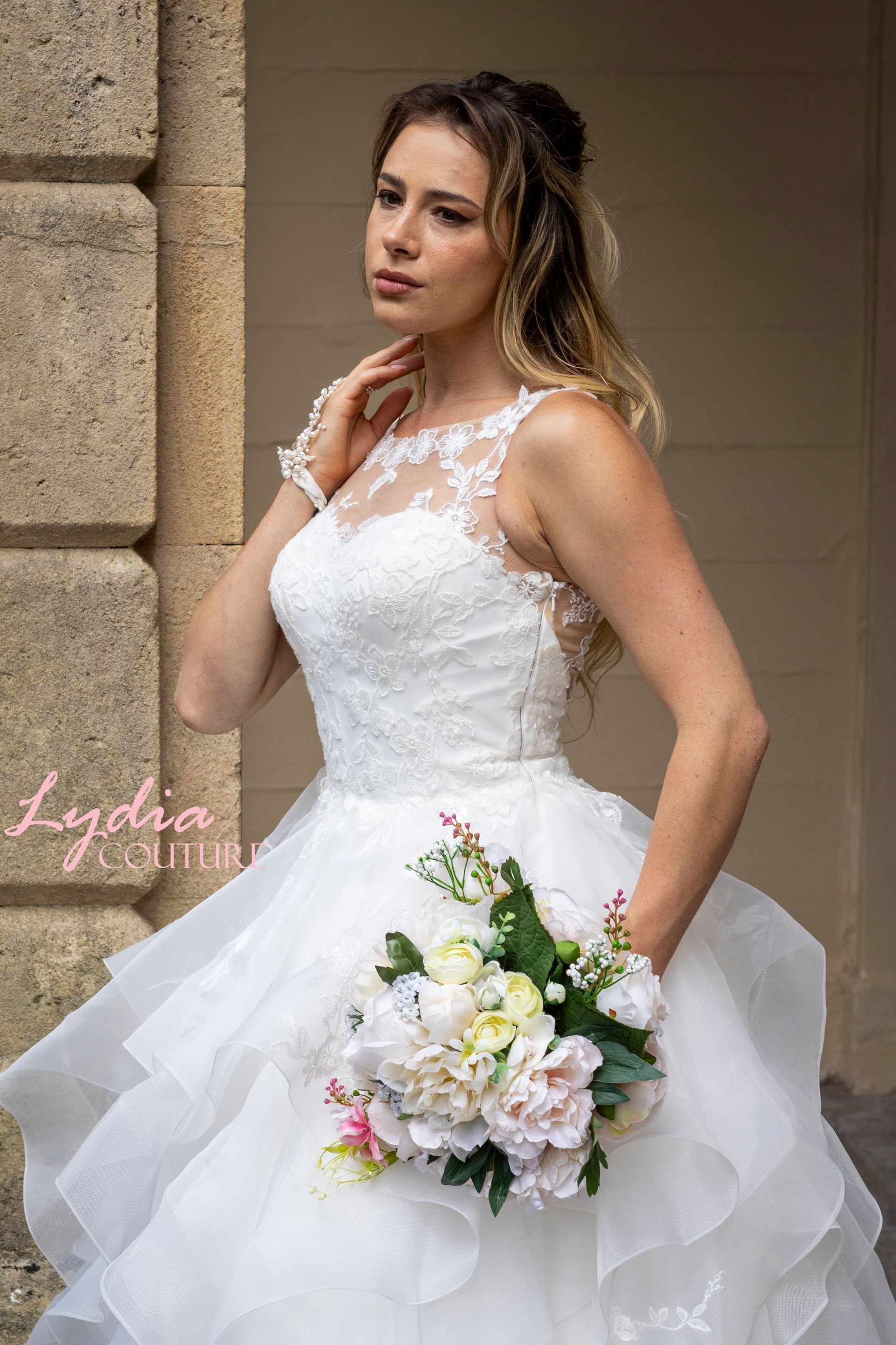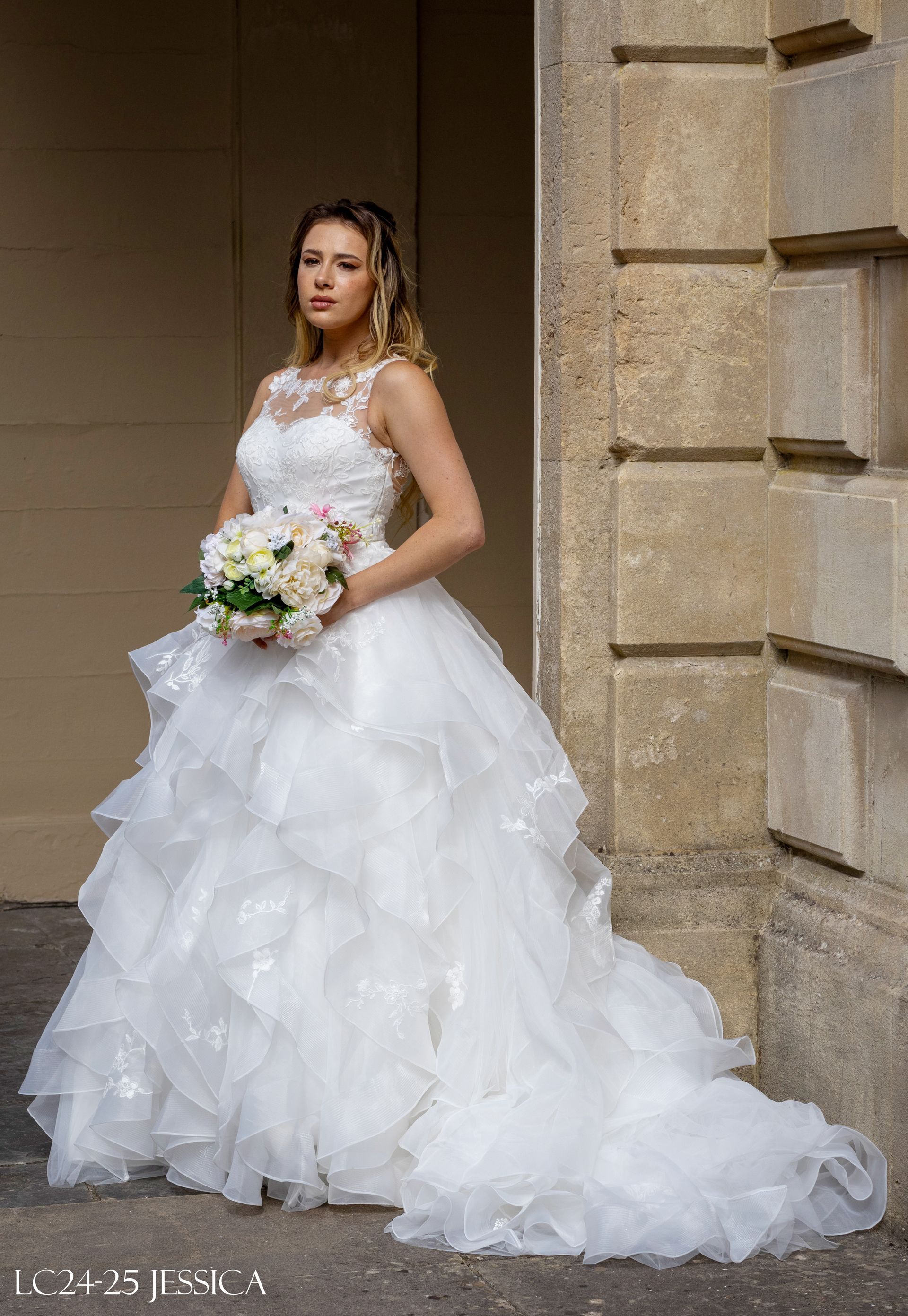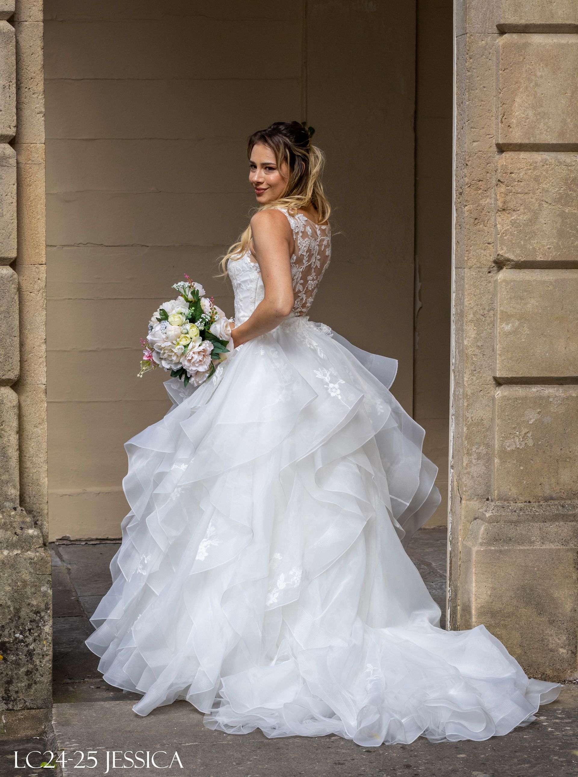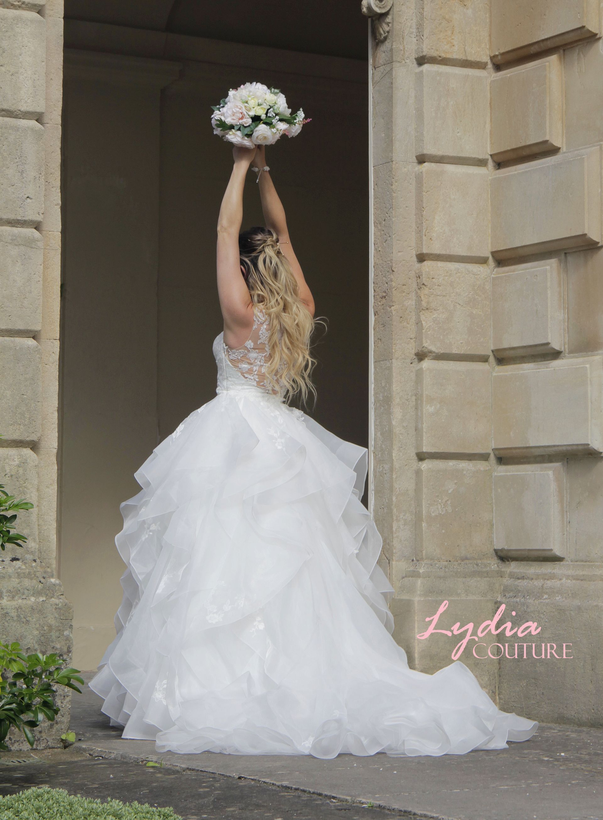 A-line ballgown style, the upper part of the neckline front is see through, the back is transparent with lace applique detailing. It has an invisible zipper on the side and the shoulder has hook and eye closure on one side only The skirt is ruffled organza fabric. Light weight with a long train. Colour Ivory & Skin option All ivory.