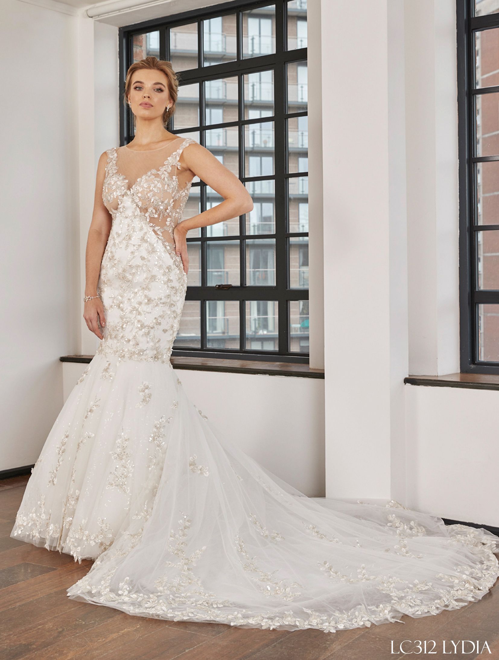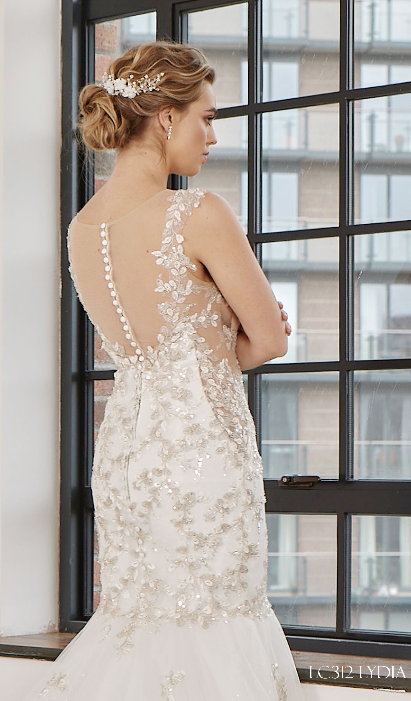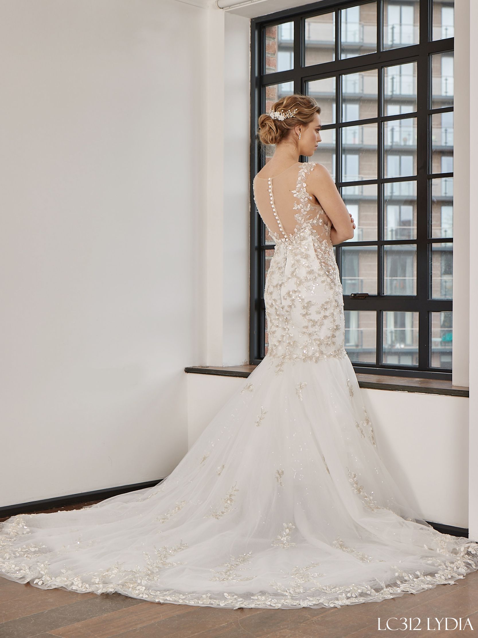 Lydia's dress is a mermaid style, sexy and elegant. She will look stunning on any bride who wants to create that modern look on her wedding day. She will be a perfect fit for a smaller and medium size bride who believes in herself and knows the kind of look she wants to achieve on her wedding day.