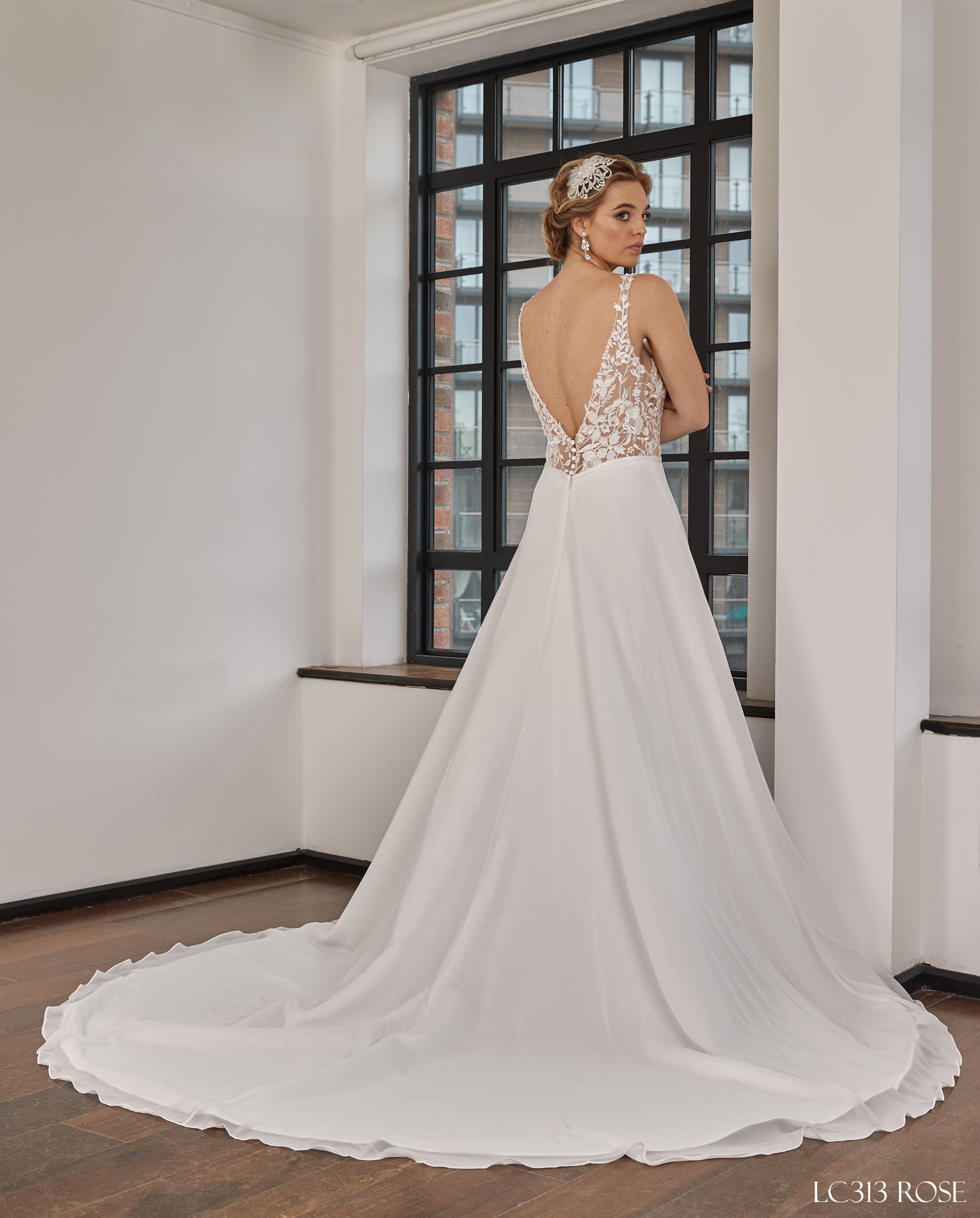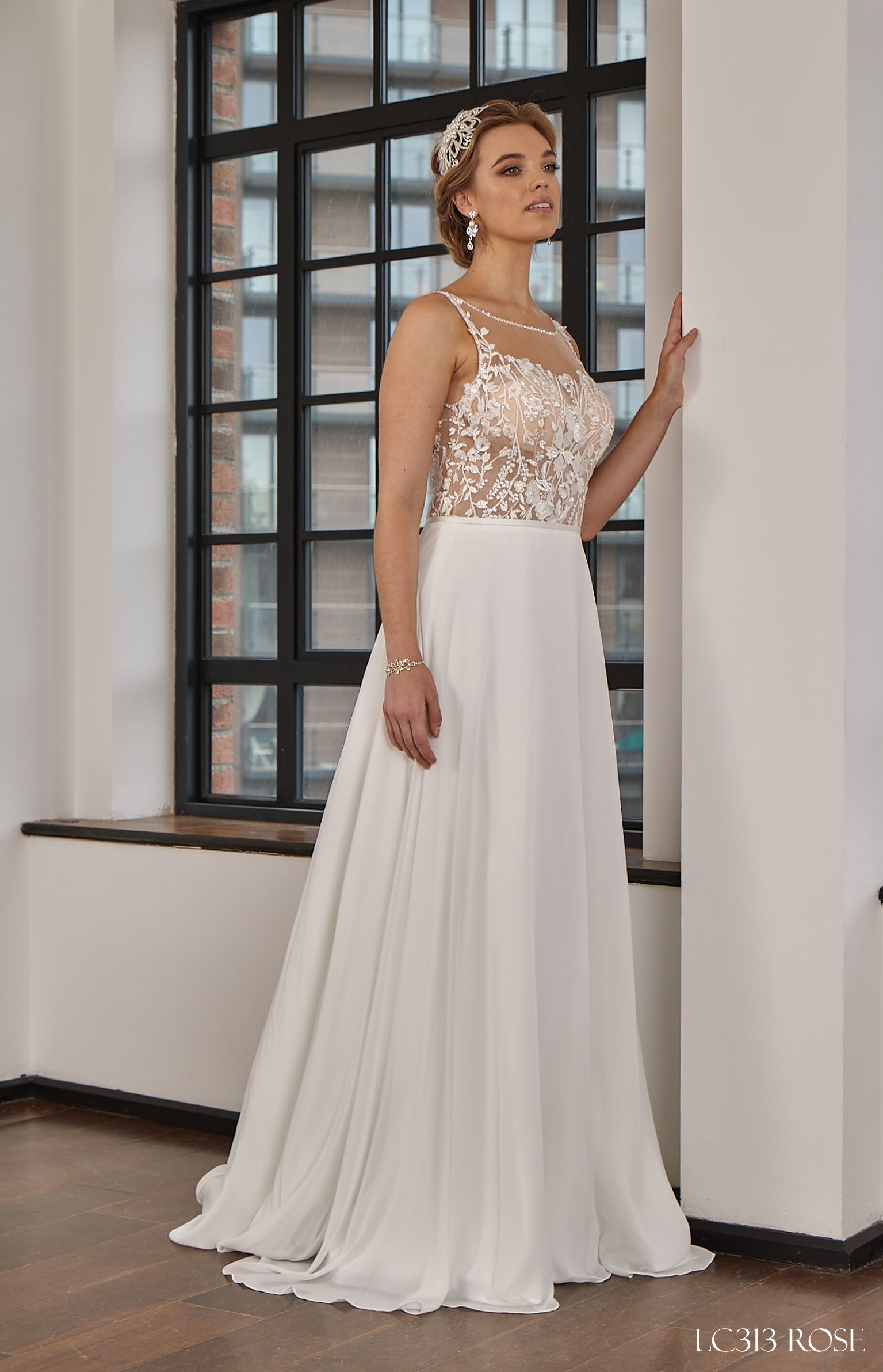 Rose's dress has a chiffon flowy skirt and illusion bodice, which is lovely, romantic, simple and elegant. She will look gorgeous on any bride who wants to create that modern look on her wedding day. She will be a perfect fit for a smaller and medium size bride. This exciting dress is created to make the bride who is wearing it look her best, walking down the aisle on that big day. The entire dress is light weight, it is made to feel comfortable for a bride wearing it all day without any struggle to move about.