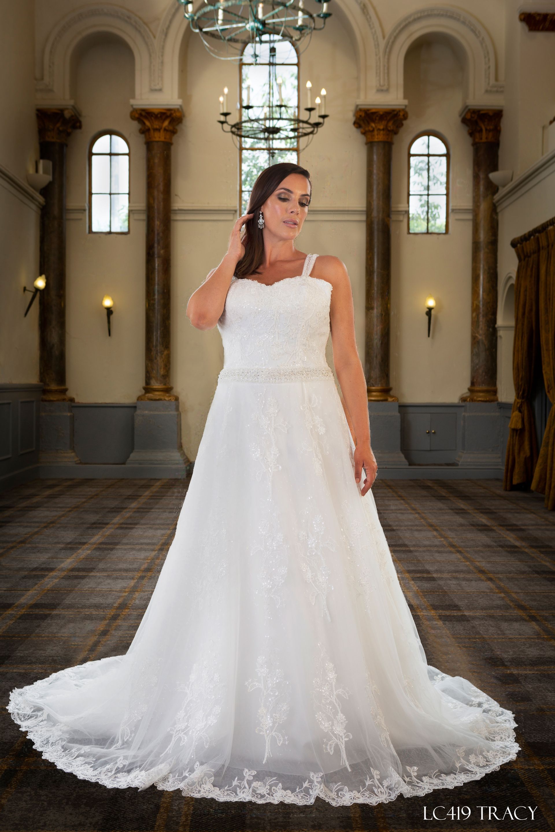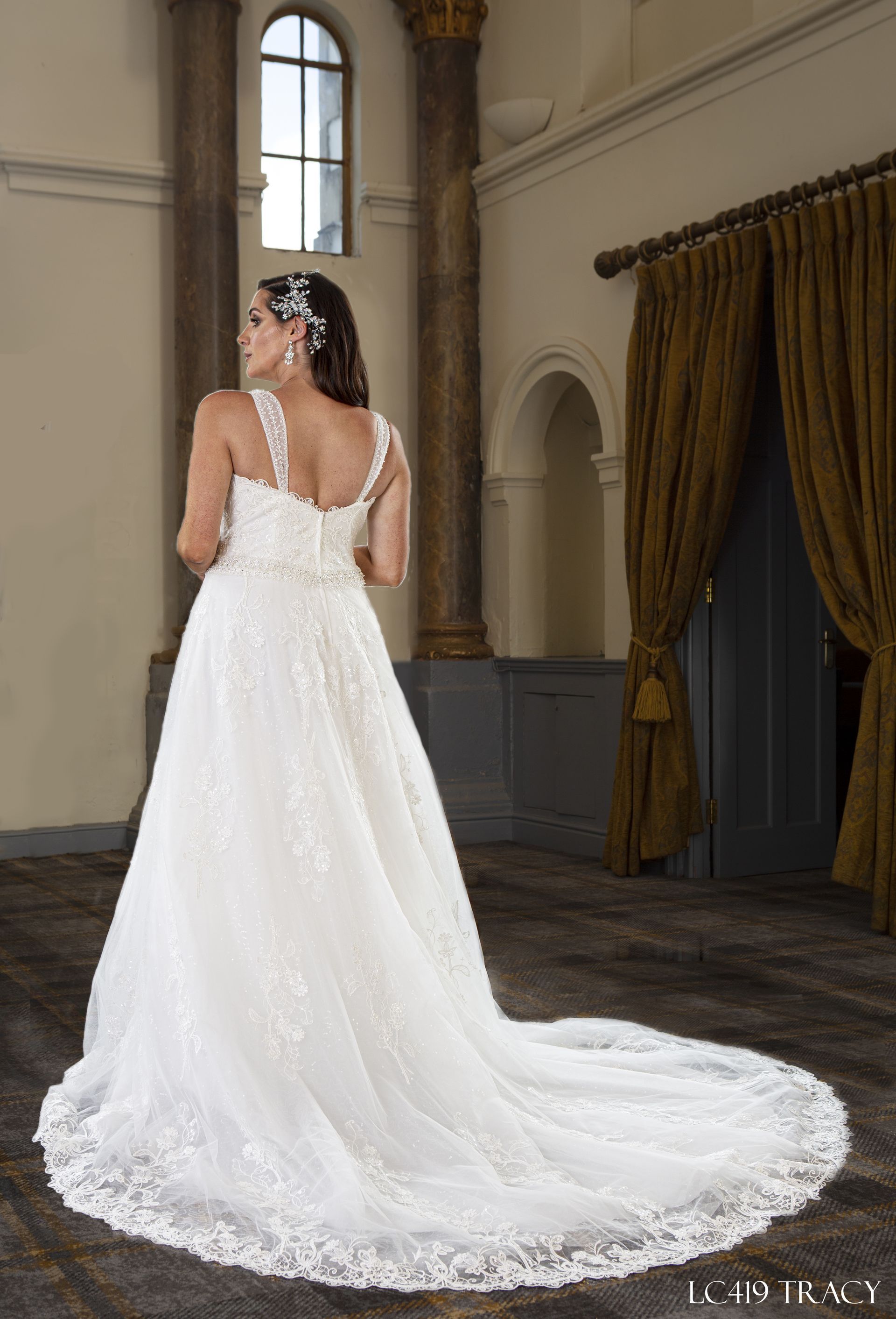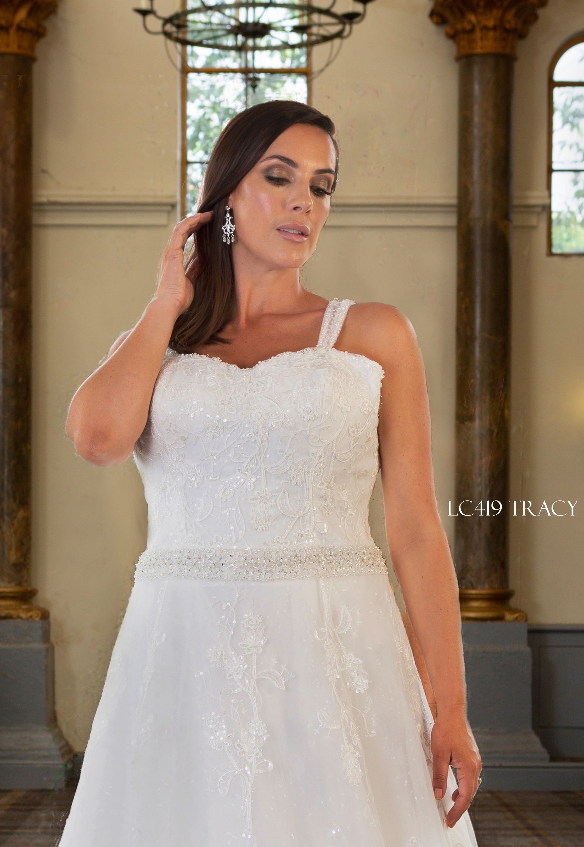 Tracy's dress is sweetheart neckline, A-line drop waist style, very beautiful and light weight and well structured. It is created to suit medium size and curvy bride. The dress has wide straps so the bride who is wearing it will feel comfortable all day without any struggle to move about.